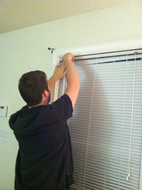 My wonderful husband (and his long arms) took care of trading the blinds. Fortunately, the blinds downstairs in the living room (that got ripped) are the same length and width as the guest bedroom. The living room windows are also much longer than the guest bedroom window so it worked out so perfectly.